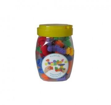 Plastikowe opakowanie w kształcie dużego słoika zawiera 55 klocków w pięciu wyrazistych kolorach: pomarańczowym, żółtym, niebieskim, zielonym oraz czerwonym.