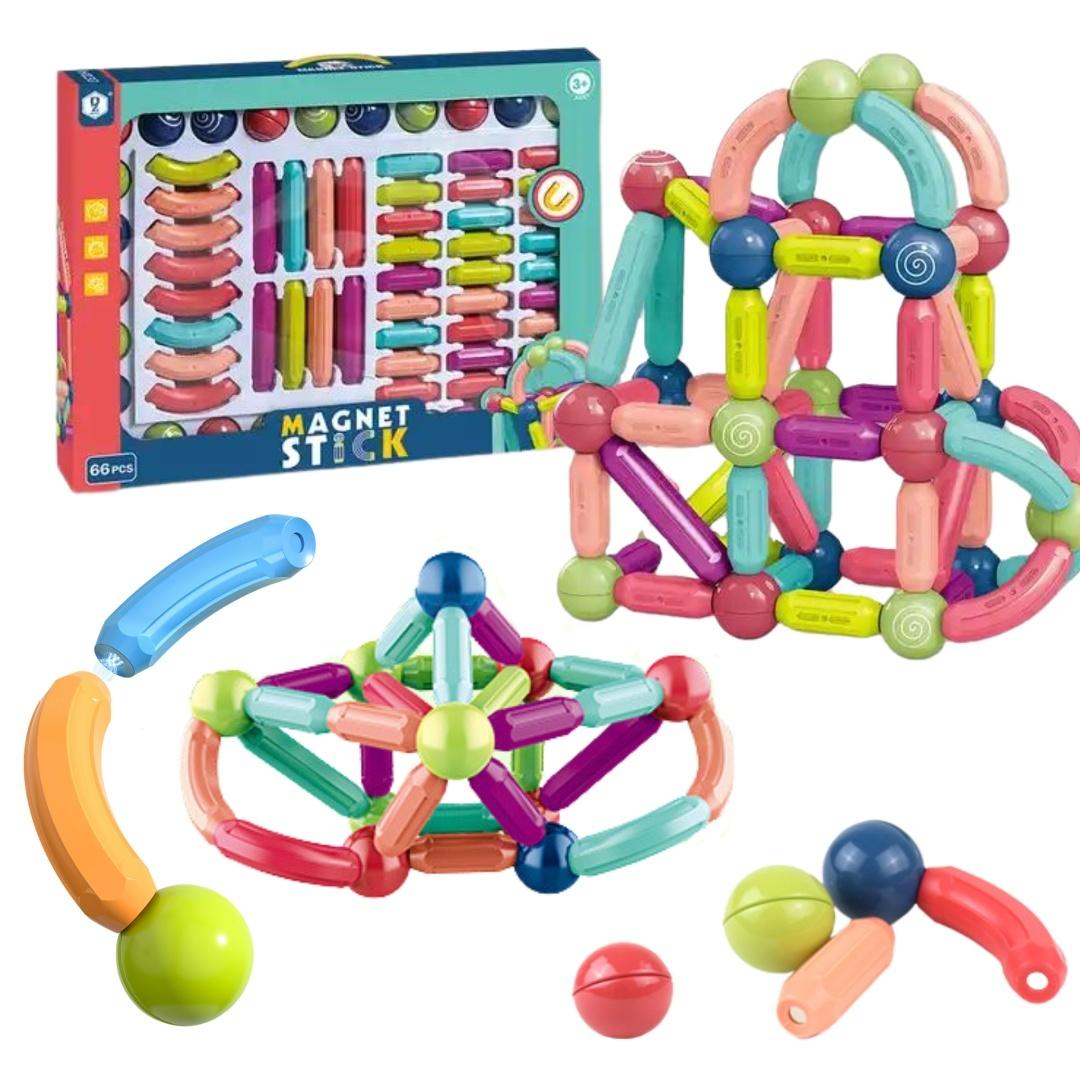 Klocki rozwijają zdolności praktyczne dzieci, kształtują umiejętności myślenia przestrzennego oraz doskonalą koordynację ręka-oko. Magnetyczne pręty i kolorowe kulki zachęcają do eksperymentowania i konstruowania, a instrukcje pozwalają na zbudowanie modeli, jednocześnie dając swobodę tworzenia własnych struktur.