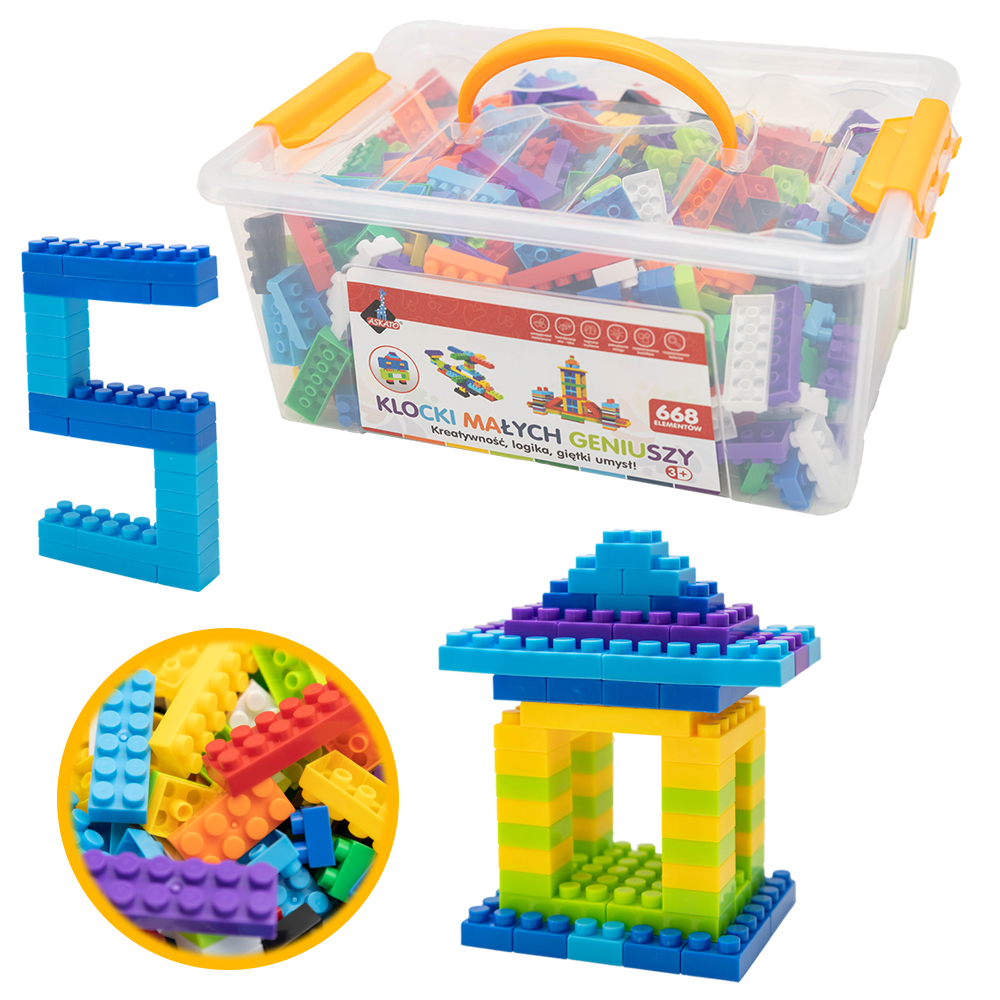 Klocki w kształcie płytek to nieograniczone możliwość dla dziecka w tworzeniu wyjątkowych budowli. Klocki o różnej długości i różnych kolorach. Klocki-płytki to 668 sztuk zamkniętych w ładnym i trwałym opakowaniu, które zapobiega zgubieniu klocków. Ilość elementów: 668