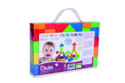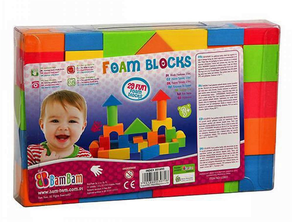 Zestaw 29 elementowych klocków, wykonanych z pianki dla małego konstruktora. Przeznaczone dla dziecka od 18 m-ca życia. Intensywne kolory rozwijają percepcję dziecka. Zestaw klocków daje niepowtarzalną okazję do rozwinięcia wyobraźni, zdolności manualnych oraz koordynacji ruchowej. Poprzez zabawę dziecko uczy się logicznego myślenia, posługiwania się przedmiotami i dopasowywania ich od siebie.
