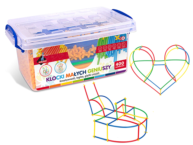 Klocki słomkowe do łączenia - 400 elem. Klocki - patyczki, któe za pomocą krzyżaków, można łączyć w różne figury. 400 elementów w różnych kolorach. Patyk-słomka o wymiarach 19x0.5 cm