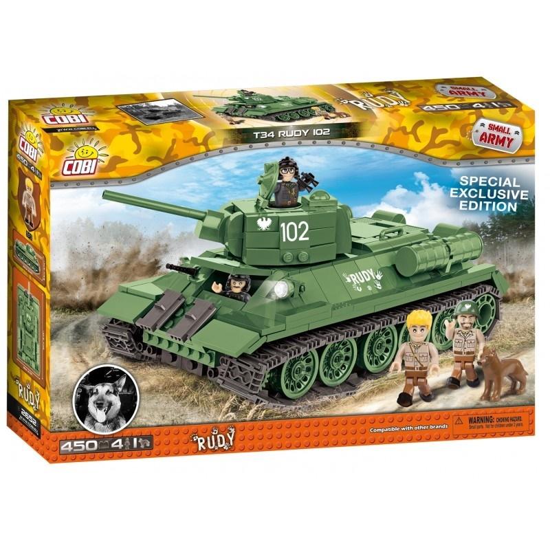 Czołg średni T-34 Rudy 102 2652. Słynny czołg T34/85 z polskiego serialu Czterej Pancerni i pies był rozwojową wersją czołgu średniego T-34/76, sowieckiej konstrukcji z okresu II wojny światowej. Czołg T-34/85 został zbudowany w klasycznym układzie konstrukcyjnym o kadłubie z pochyłymi ścianami, utrudniającymi przebicie przez pociski artylerii przeciwpancernej. Pancerz tworzyły walcowane płyty pancerne o grubości do 60 mm. Wnętrze pojazdu podzielone było na trzy przedziały: kierowania, bojowy i napędowy. Od roku 1949 były one zasadniczym typem czołgów dywizji pancernych i zmechanizowanych w Polsce, choć już wcześniej zaczęły wypierać T-34/76. Polska wykupiła w 1951 roku licencję na jego produkcję - do chwili jej zakończenia w 1956 r. Zakłady Mechaniczne Łabędy w Łabędach koło Gliwic zbudowały 1380 czołgów, z których 1108 przekazano jednostkom ludowego Wojska Polskiego. W zestawie znajdziesz figurki bohaterów serialu: Gustlika, Wichury, Grigorija i Janka. Nie może zabraknąć również słynnego psa Szarika. Klockowy model czołgu ma obracaną wieżyczkę oraz otwierany właz i pokrywę silnika, ruchomą lufę, która unosi się góra-dół.
