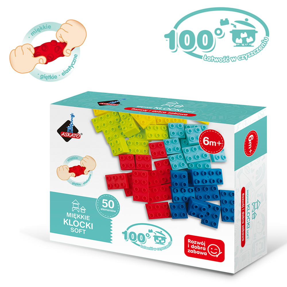 Miękkie klocki dla maluchów, które można czyścić w gorącej wodzie do 100C. Kompatybilne z wiodącymi markami na rynku. Zestaw 50 klocków. 6 mies.+ POLSKIE OPAKOWANIE