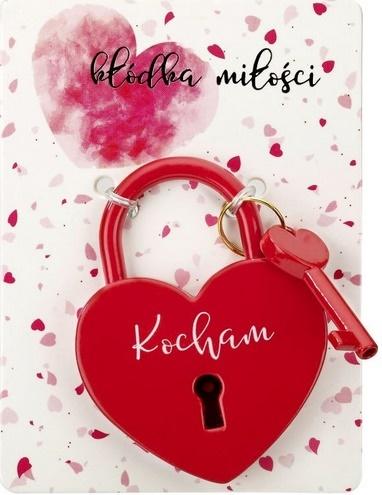 Kłódka jest w kształcie serca oraz posiada dedykację Kocham .
