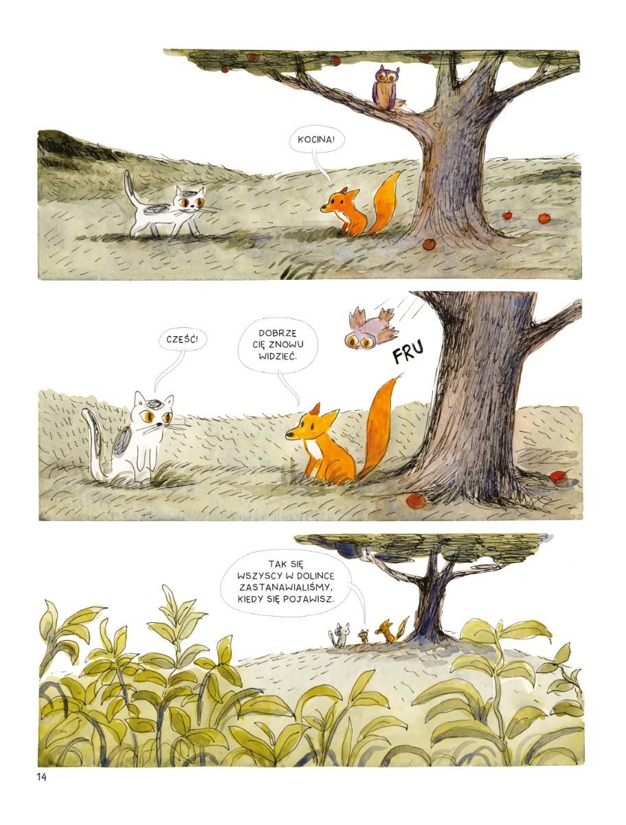 "Jak pewnie wiecie, świat Malutkiego Liska i Wielkiego Dzika rządzi się własnymi prawami i żaden człowiek nie ma do niego wstępu, nawet ja - autorka! Na szczęście wysyłam tam co jakiś czas swoją wspaniałą przedstawicielkę - Kocinę. To ona przynosi mi wiele ważnych informacji o Lisiej Dolinie. Uważam ją za pełnoprawną współautorkę tej książki. Poświęciła temu projektowi mnóstwo czasu, choć pewnie wolałaby robić to, co tak lubi: wylegiwać się na kanapie i bawić się zabawkami w mojej pracowni. Jestem z niej dumna!"