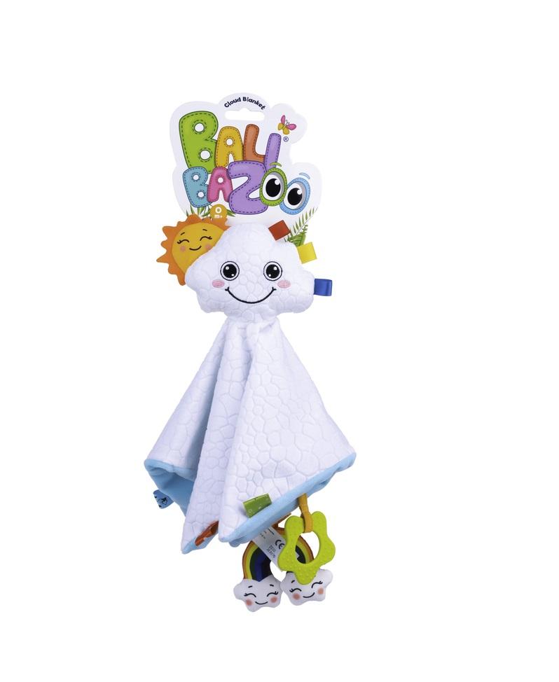 Pluszaki Luzaki uwielbiają zabawę na świeżym powietrzu, a na piknik najchętniej zabierają Kocyk Chmurkę, który jest milutki i kryje wiele niespodzianek. Znajdziemy tu kolorowe metki o zróżnicowanej fakturze, do stymulowania zmysłu dotyku bobasa, grzechotkę w kształcie chmurki, miękki gryzaczek i szeleszczący element, słoneczko.