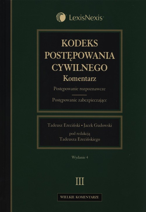 Oddajemy do rąk Czytelników kolejne wydanie profesjonalnego komentarza do Kodeksu postępowania cywilnego. Autorstwo najwybitniejszych autorytetów polskiej procedury cywilnej oraz długoletnia obecność dzieła na rynku wydawniczym gwarantują najwyższy poziom merytoryczny i edytorski publikacji. Tomy I–III obejmują komentarz do dwóch części Kodeksu: części pierwszej – postępowania rozpoznawczego i części drugiej – postępowania zabezpieczającego. W tomie IV omówiono postępowanie egzekucyjne (część trzecia), a w tomie V – przepisy z zakresu międzynarodowego postępowania cywilnego (część czwarta) oraz dotyczące sądu polubownego (arbitrażowego) (część piąta).