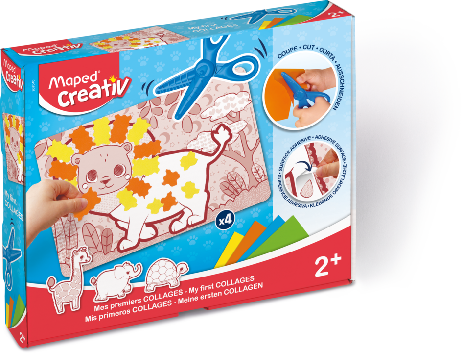 Pierwszy kolaż w zasięgu ręki. Zwierzątka umieszczone na kartach z klejącą powierzchnią tylko czekają, aż ktoś je przyozdobi przy użyciu różnokolorowych papierów powycinanych ząbkowanymi nożyczkami. To możesz być Ty! Z łatwością sprawisz, że będą wyglądały niesamowicie!