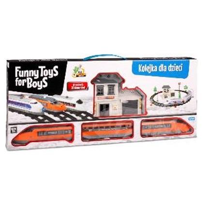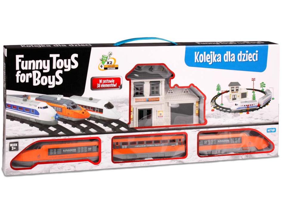 Kolejka 38 el. W zestawie 2 lokomotywy, 1 wagon, budynek dworca, znaki kolejowe, drzewa, tory, średnia toru 74cm