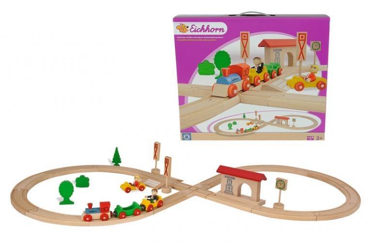 Drewniana kolejka z elementami torów, dwóch wagonów, z figurkami i akcesoriami,