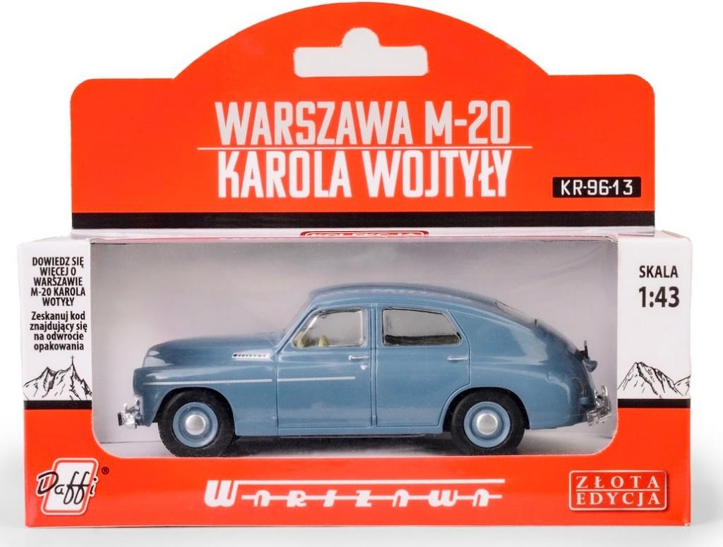 Warszawa M-20, została zakupiona dnia 28 października 1958 roku przez Karola Wojtyłę, który był wówczas biskupem pomocniczym w Archidiecezji Krakowskiej. Pojazd, któremu nadano numer rejestracyjny KR-96-13 był dla Karola Wojtyły niezawodnym środkiem lokomocji. Karol Wojtyła użytkował samochód wyłącznie jako pasażer, ponieważ nie posiadał prawa jazdy. Ze względu na częste podróże i zamiłowanie do czytania, w samochodzie z prawej strony przy tylnym siedzeniu zamontowano lampkę. Samochód był użytkowany przez Karolę Wojtyłę do roku 1977. Na opakowaniu umieszczono kod QR, który po zeskanowaniu odsyła do strony z informacjami i ciekawostkami o historii samochodu.