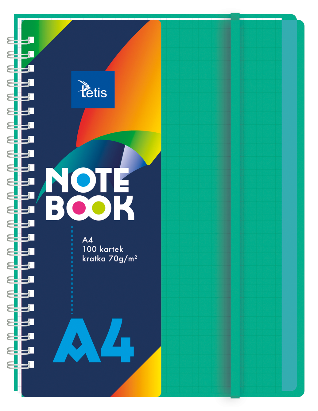 Kołonotatnik w oprawie PP. Posiada plastikowe transparentne przekładki (5 sztuk) i gumkę dopasowaną do koloru okładki. Gramatura papieru: 70 g/m2