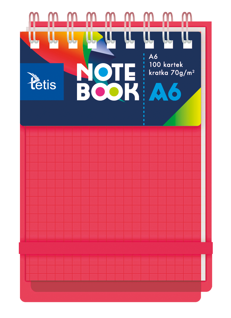 Kołonotatnik w oprawie PP. Posiada plastikowe transparentne przekładki (5 sztuk) i gumkę dopasowaną do koloru okładki. Gramatura papieru: 70 g/m2