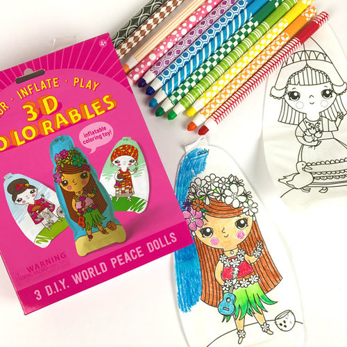 Kolorowanki 3D to śliczne laleczki z różnych stron świata do samodzielnego stworzenia. Najpierw pokoloruj laleczki za pomocą kredek lub flamastra, potem nadmuchaj je załączoną do zestawu słomką, aby uzyskać wyjątkową zabawkę.