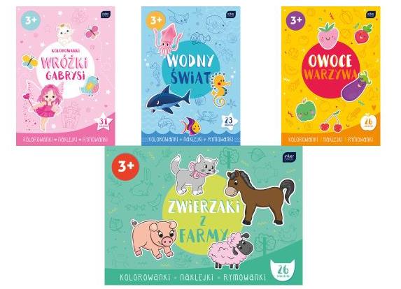 Kolorowanka w formacie A4, 16 stron. Okładka pokryta błyszczącym lakierem. Książeczka zawiera obrazki do kolorowania oraz naklejki. Dzieci mają za zadanie odszukać właściwą naklejkę, a następnie pokolorować ilustrację według wzoru.