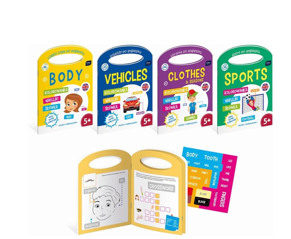 - Zawiera kolorowanki, naklejki i zadania pomagające w poznaniu i utrwaleniu słownictwa w języku angielskim.