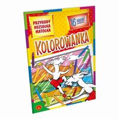 Kolorowanka Przygody Koziołka Matołka"" to książeczka dla dzieci opowiadająca przygody rozbrykanego mieszkańca Pacanowa. Zeszyt zawiera 16 dużych, kolorowych naklejek, 16 jeszcze większych ilustracji do pokolorowania