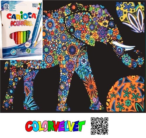 "Kolorowanka z welwetowymi w dotyku konturami (pokrytymi czarnym welurem). Wypukłe linie ułatwiają nie wychodzenie za linie, a na głębokiej matowej czerni nie widać drobnych potknięć przy kolorowaniu. Welwet nałożony jest na papier przyklejony do sztywnej tektury, dzięki czemu obraz nie wymaga ramki jeśli zdecydujemy się go powiesić na ścianie. Specjalny papier sprawia że kolory są bardziej intensywne. Można kolorować flamastrami, kredkami, temperami, wszystkim co pisze po papierze. Można stworzyć rewelacyjne efekty za pomocą cieniowania. Rozmiar arkusza 47x35 cm. W zestawie 12 flamastrów z filcowymi końcówkami. Nieodpowiednie dla dzieci w wieku poniżej 36 miesięcy. Made in Italy."