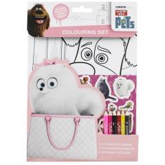 Zestaw zawiera: 8 kartek z jednostronnymi szkicami do pokolorowania, arkusz z 13 naklejkami oraz 6 ołówkowych kredek. Dodatkowo z opakowania można wyciąć kolorową zawieszkę na drzwi (kształ zawieszki narysowny).