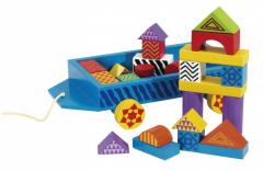 Drewniany wózeczek na kółkach ze sznurkiem, a w nim kolorowe klocki.