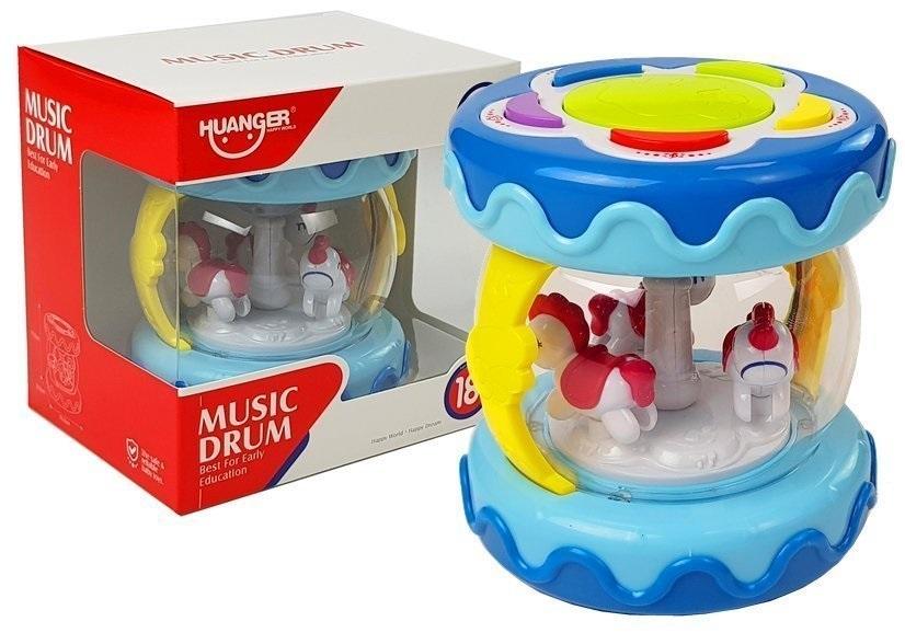 Interaktywny bębenek muzyczny z Karuzelką Niebieski Interaktywny, muzyczny bębenek sprawi frajdę każdemu maluchowi, którego już teraz pasjonuje muzyka i przyjemne dźwięki. Bawiąc się tym produktem, samo będzie decydować, co zaraz usłyszy. Uderzając w bębenek, młody muzyk przeniesie się w świat melodii, płynących z tych dźwięcznych instrumentów. Muzyczna zabawka nie tylko zachęci malucha do psot, ale pozytywnie wpłynie na rozwój i edukację dziecka. Wspólne zabawy z wykorzystaniem przedstawionego bębenka zachęcą dziecko do aktywności, a także zaangażują wiele zmysłów, wpływając równocześnie na jego emocje. Bębenek wyposażony jest w jeden duży przycisk znajdujący na samym środku uruchamiający funkcję bębenka. Wkoło rozmieszczone są dotykowe przyciski odpowiadające za różne dźwięki i melodie. Dotykając nutkę usłyszymy wesołą muzyczkę, natomiast przyciski, na których widnieją dziecinne akcesoria takie jak śpiochy, wózek, butelka czy śliniak odpowiadają za odgłosy zwierząt i inne wesołe dźwięki. Różowy przycisk z trójkącikiem służy nam do wyboru wariantów muzycznych na przyciskach. Zabawka posiada regulację głośności oraz efekty świetlne. Dodatkowym atutem skupiającym uwagę dziecka jest znajdująca się w środku bębenka karuzela z kucykami. Zaopatrzenie dziecka w zabawkowy instrument, znakomicie sprawdzi się podczas ćwiczeń małych paluszków, a także koordynacji wzrokowo-manualnej, co w przyszłości ułatwi naukę pisania, a także rozwinie logiczne myślenie. Uruchomienie wszystkich funkcji zabawki wymaga użycia 3 sztuk baterii AA, które nie zostały dołączone do zestawu. Wymiary bębenka: 11,5 cm x 10,5 cm x 10,5 cm Wymiary Opakowania: 14 cm x 11 cm x 13,5 cm