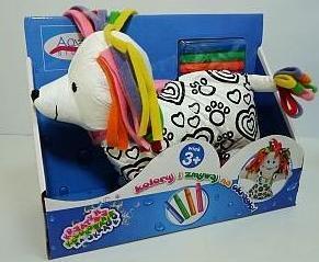 W skład tego zestawu wchodzi piesek-maskotka i 4 zmywalne flamastry. Na łebku pieska znajdują się kolorowe paseczki. Podobne ozdoby tworzą jego ogon. Na tułowiu pieska widnieją serduszka i odciśnięte łapki.