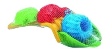 Zawiera łopatkę, grabki i trzy foremki. Całość spakowana jest w siatkę. Wymiary ok. 26 cm x 11 cm x 7,5 cm