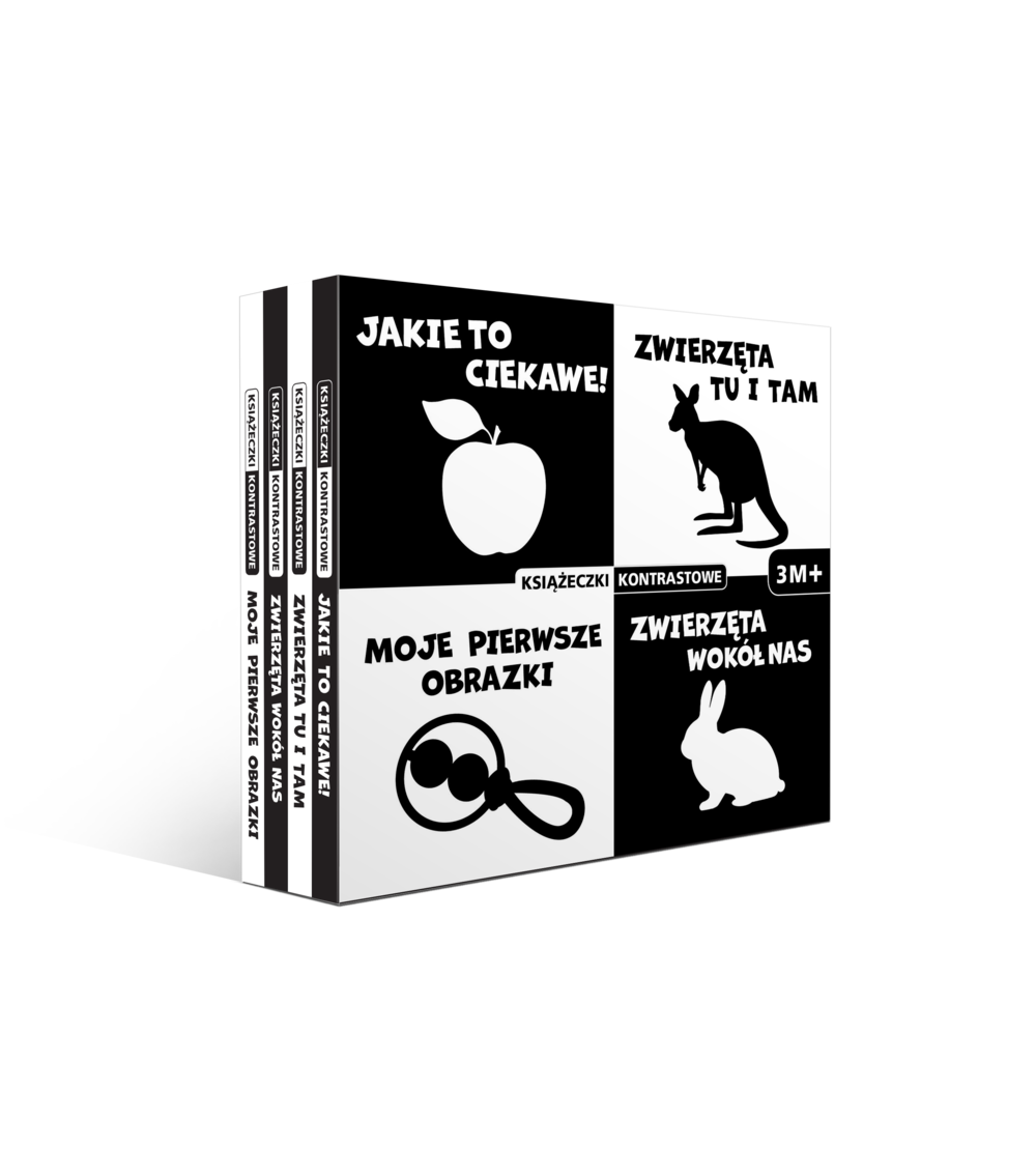 Dwa zestawy książeczek kontrastowych w etui. Jeden przeznaczony dla maluszków od 3. miesiąca życia, a drugi dla niemowląt od 6. miesiąca życia. Książeczki oparte na czarno-białym kontraście przyczyniają się do optymalnego rozwoju Twojego dziecka!