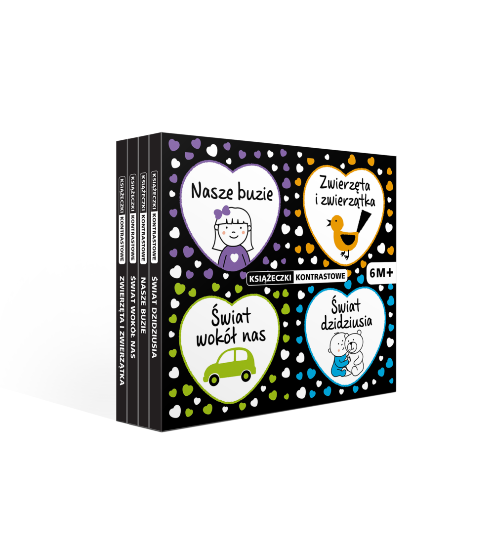 Dwa zestawy książeczek kontrastowych w etui. Jeden przeznaczony dla maluszków od 3. miesiąca życia, a drugi dla niemowląt od 6. miesiąca życia. Książeczki oparte na czarno-białym kontraście przyczyniają się do optymalnego rozwoju Twojego dziecka!