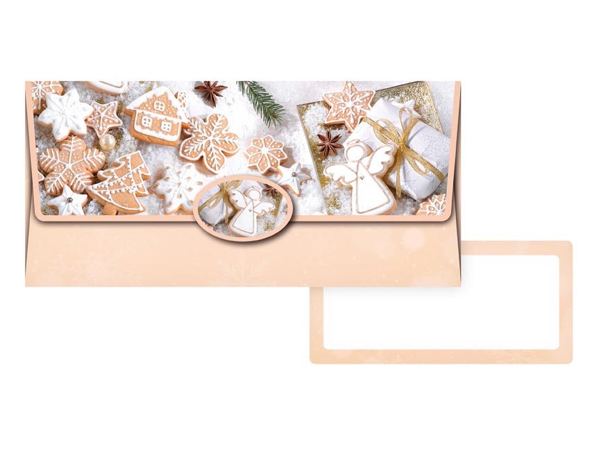 Koperta podarunkowa. Wewnątrz znajduje się ozdobna karteczka, na której można napisać życzenia. Każda koperta jest zapakowana osobno w folię z zawieszką euro.