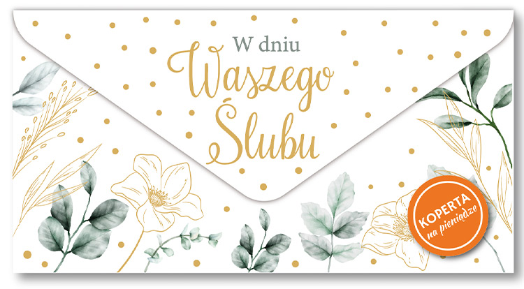 Koperta podarunkowa na Ślub KOP-025 Koperta podarunkowa jest eleganckim sposobem na podarowanie bliskiej osobie banknotu lub karty podarunkowej. Koperta jest kolorowa i uszlachetniona metalizowaną folią hot-stamp, jest solidnie wykonana i wyposażona w rzep, co umożliwia jej wielokrotne otwieranie i zamykanie. Koperta zawiera życzenia w środku. Specyfikacja: wymiary: 20 x 10,5 cm (po złożeniu) wnętrze: życzenia w środku okazja: Ślub