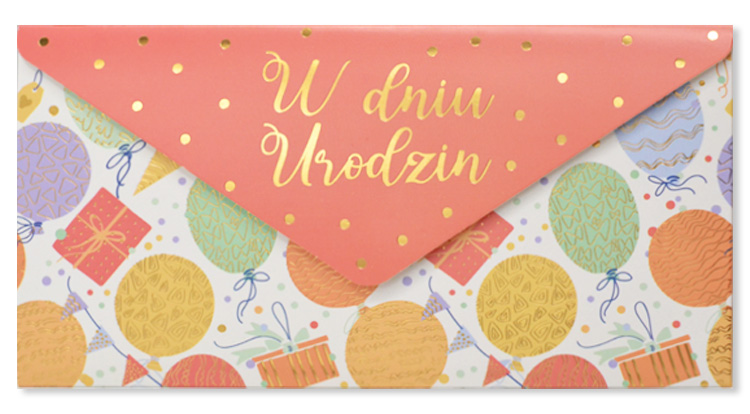 Koperta podarunkowa KOP-022 "W dniu urodzin" Koperta podarunkowa jest eleganckim sposobem na podarowanie bliskiej osobie banknotu lub karty podarunkowej. Koperta jest kolorowa i uszlachetniona metalizowaną folią hot-stamp, jest solidnie wykonana i wyposażona w rzep, co umożliwia jej wielokrotne otwieranie i zamykanie. Koperta zawiera życzenia w środku. Specyfikacja: wymiary: 20 x 10,5 cm (po złożeniu) wnętrze: życzenia w środku okazja: urodziny Koperty są pakowane po 3 szt.