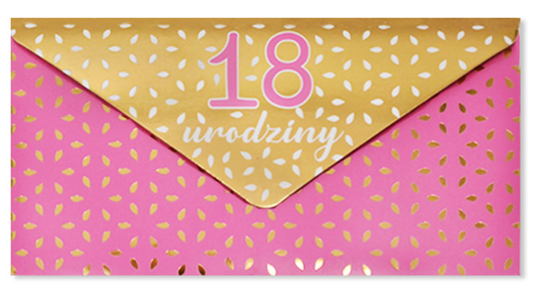 Koperta podarunkowa KOP-024 "18 urodziny" Koperta podarunkowa jest eleganckim sposobem na podarowanie bliskiej osobie banknotu lub karty podarunkowej. Koperta jest kolorowa i uszlachetniona metalizowaną folią hot-stamp, jest solidnie wykonana i wyposażona w rzep, co umożliwia jej wielokrotne otwieranie i zamykanie. Koperta zawiera życzenia w środku. Specyfikacja: wymiary: 20 x 10,5 cm (po złożeniu) wnętrze: życzenia w środku okazja: osiemnastka, urodziny Koperty są pakowane po 3 szt.