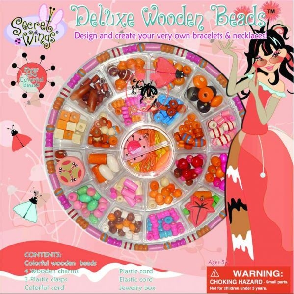Deluxe Wooden Beads to olbrzymi zestaw kolorowych drewnianych koralików i ozdób wraz z akcesoriami w plastikowej szkatułce. Należy on do serii Secret Wings, która robi furorę wśród dzieci na całym świecie, z powodu postaci pięciu wróżek: Tansy, Poppy, Ivy, Honey i Lily.
