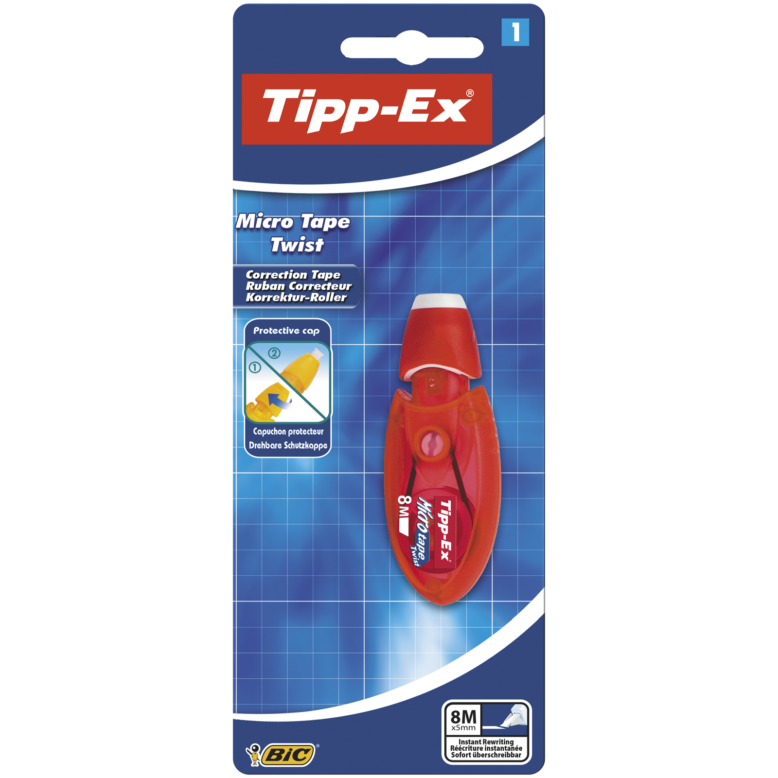 Kieszonkowy korektor w taśmie. Obrotowa nasadka chroniąca taśmę. Przeźroczysta obudowa umożliwia kontrolę zużycia taśmy. Mechanizm przewijania taśmy. Poliestrowa taśma korygująca odporna na rozerwania. Precyzyjny podajnik taśmy. Wymiary taśmy: 5 mm x 8 m. Produkt nie zawiera PVC - polichlorku winylu.