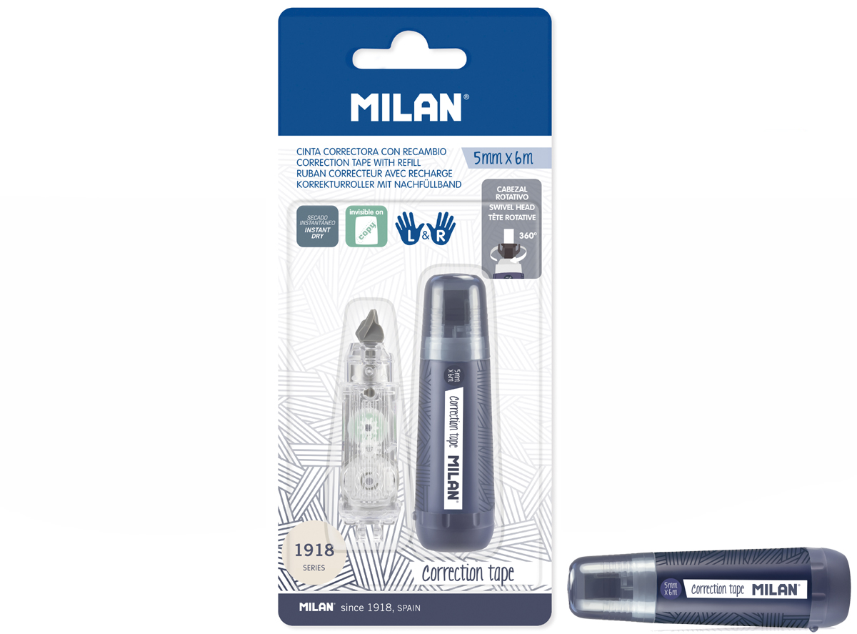 Cylindryczna taśma korekcyjna z serii 1918 w kolorze granatowym. Odpowiedni dla osób leworęcznych dzięki obrotowi końcówki o 360 stopni. Szybko, czysto i precyzyjnie. Korekty na wszystkich rodzajach papieru, nie pozostawia śladów na kserokopii lub faksie. 5 mm szerokości x 6 m długości. W zestawie wkład taśmy. Seria 1918 jest inspirowana oryginalnymi kolorami i wzornictwem gumek MILAN.