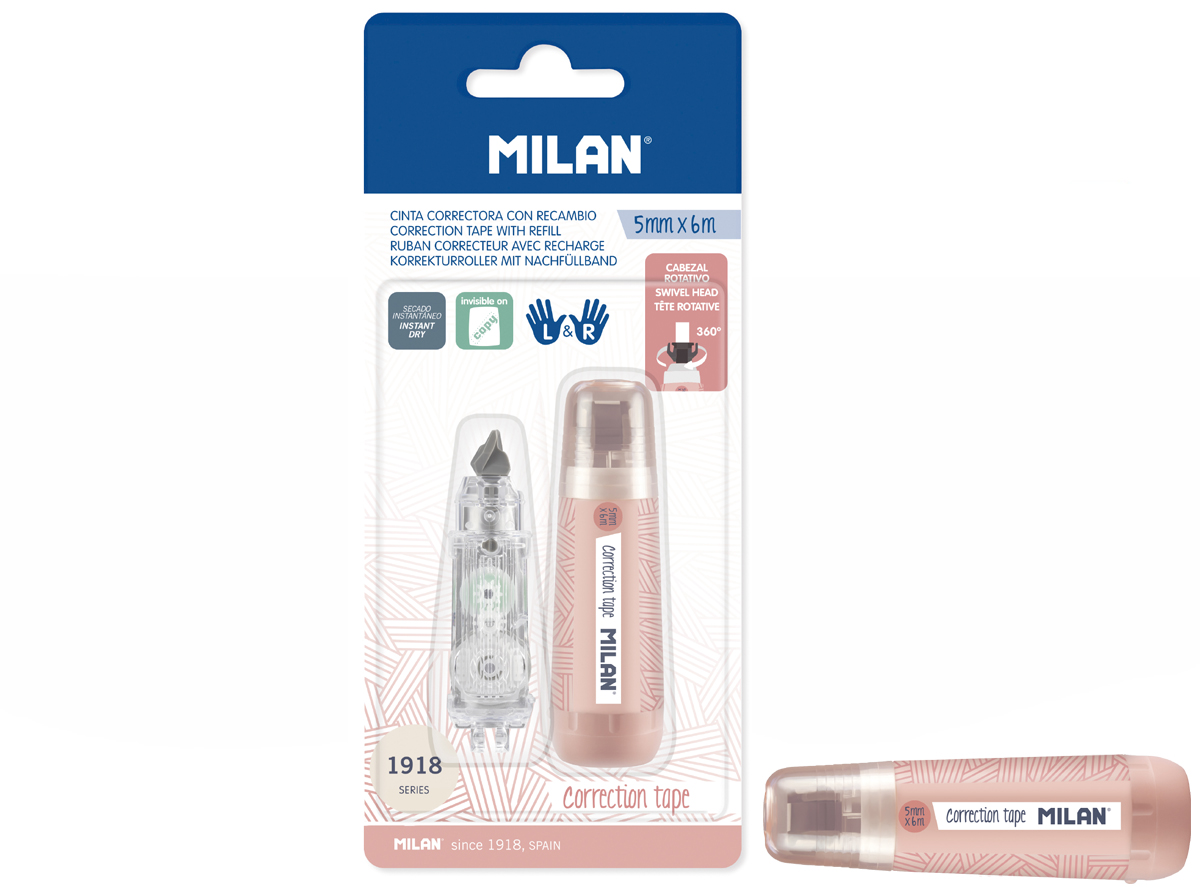Cylindryczna taśma korekcyjna z serii 1918 w kolorze różowym. Odpowiedni dla osób leworęcznych dzięki obrotowi końcówki o 360 stopni. Szybko, czysto i precyzyjnie. Korekty na wszystkich rodzajach papieru, nie pozostawia śladów na kserokopii lub faksie. 5 mm szerokości x 6 m długości. W zestawie wkład taśmy. Seria 1918 jest inspirowana oryginalnymi kolorami i wzornictwem gumek MILAN.