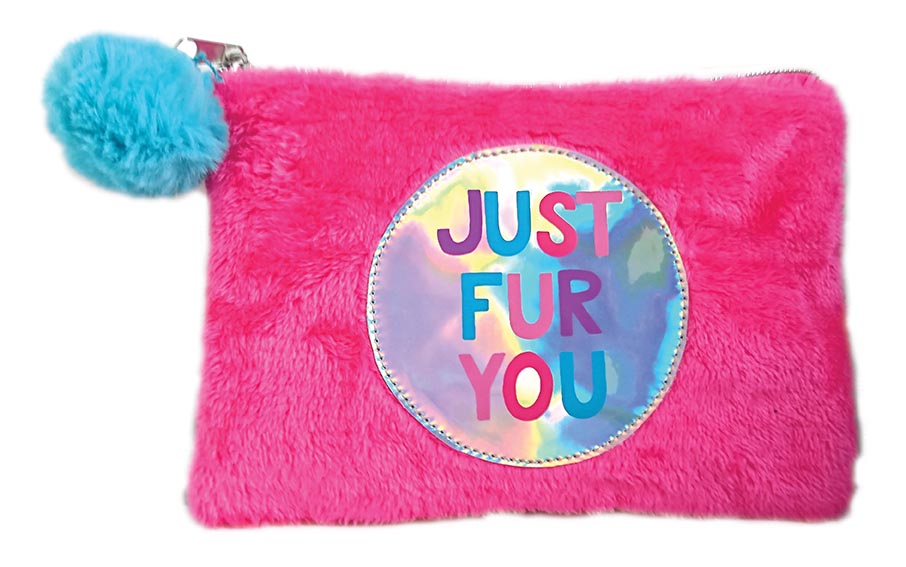 Kosmetyczka ma króciutkie, różowe futerko. Na środku znajduje się mieniący metalicznie okrąg z napisem „JUST FUR YOU”. Kosmetyczka posiada jedną komorę zamykaną na zamek błyskawiczny, na końcu którego dynda niebieski, futerkowy pompon.