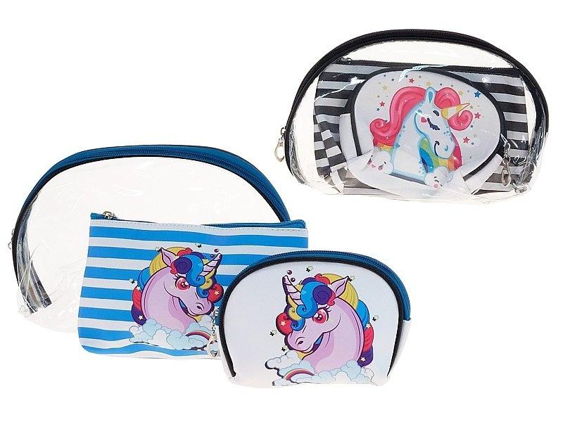 Zestaw 3 kosmetyczek z jednorożcem - 25x15x9, 21x11x4, 16x10x4cm, zapinane zamkiem; PPB. .