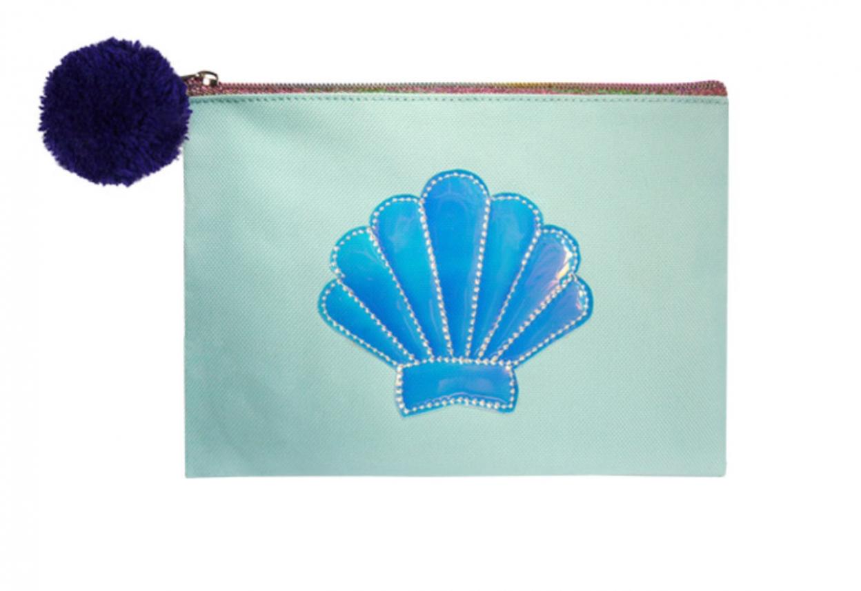 Kosmetyczka o wymiarach 15x22 cm w kolorze turkusowym holograficzna z motywem muszli.