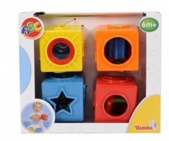 Cztery kostki do zabawy. Każda z nich ma różne, grzechoczące elementy w środku. Kostki pomagają maluchom w ćwiczeniu koordynacji ruchowej oraz koncentracji. Pobudzają także zmysł wzroku, słuchu i dotyku. Przeznaczone dla dzieci powyżej 6 miesiąca życia.