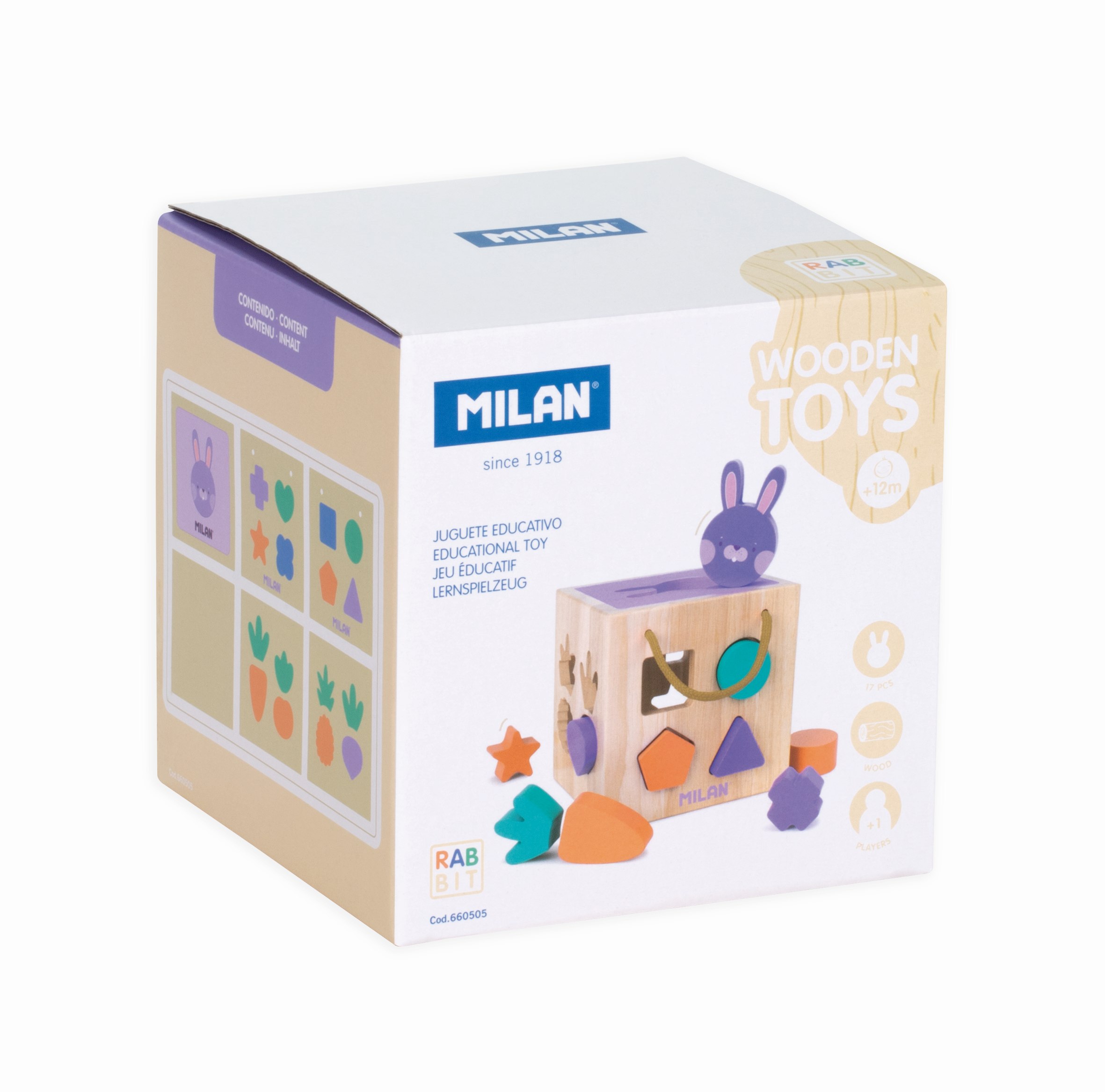 Drewniana zabawka edukacyjna "Królik" z 17 geometrycznymi, zaokrąglonymi elementami i kostką z dopasowanymi otworami oraz pokrywą do łatwego wyjmowania elementów. Zachęca do rozwoju umiejętności motorycznych, logiki i koordynacji wzrokowo-ruchowej. Zalecana od 12 miesiąca życia.