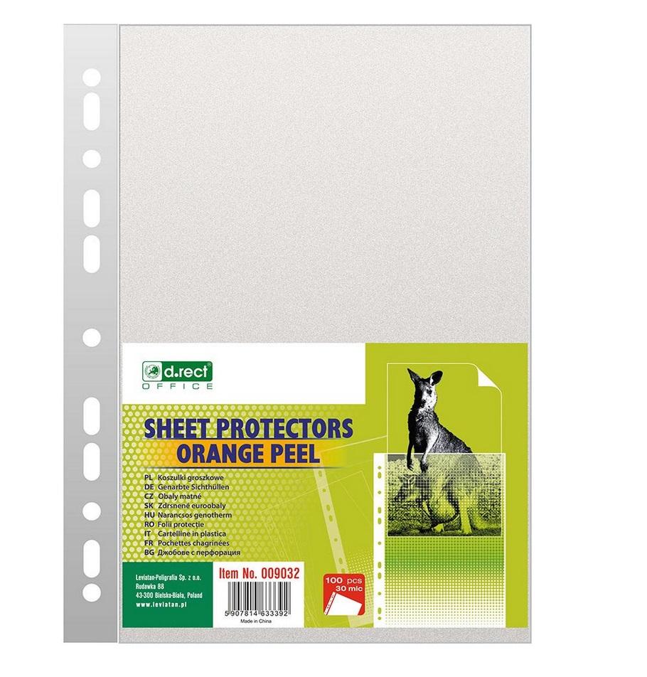 Opis produktu: - groszkowa folia 30 mic - otwierane od góry - na dokumenty w formacie A4 - antystatyczne, antyrefleksyjne - wzmocniony pasek z uniwersalną perforacją - wykonane z polipropylenu - opakowanie foliowe