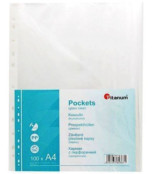 Koszulki na dokumenty w formacie A4. Otwierane od góry, antystatyczne, antyrefleksyjne, wzmocniony pasek z perforacją. Opakowanie 100szt