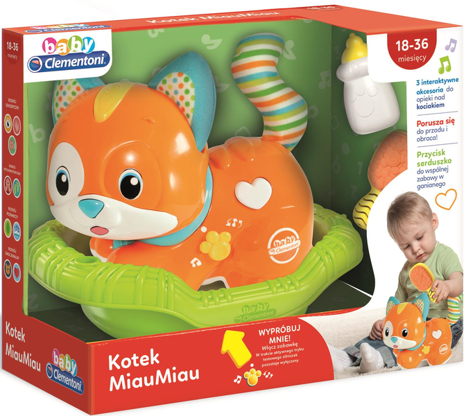 Kociak porusza się do przodu i do tyłu, zachęcając dziecko do wtórowania mu podczas zabawy. Rozpoznaje, kiedy jest przez dziecko brany i kładziony w łóżeczku i aktywuje tryb nocny.