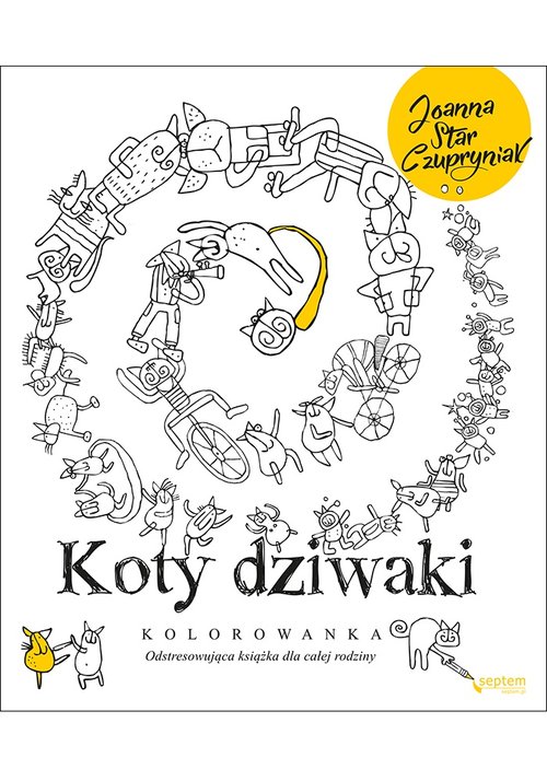 Przewrotność leży w kociej naturze od dawna wiedzą to wszyscy miłośnicy kotów. Jednak takiej przewrotności, niesamowitości, szalonej wyobraźni i pomysłowości, jaką mogą pochwalić się koty zamieszkujące strony tej kolorowanki, na pewno się nie spodziewacie. To prawdziwe koty dziwaki, jeszcze bardziej tajemnicze niż kot z Chershire, czasem demoniczne niczym Behemot, a czasem zuchwałe jak kot w butach. Są tu koty w przelocie, koty w Hyde Parku, domy na kociej łapie i piramida kociego zdrowia. Miłośnik filmów znajdzie także plakat z Cat Wars, a miłośnik gier kota i krzyżyk.
