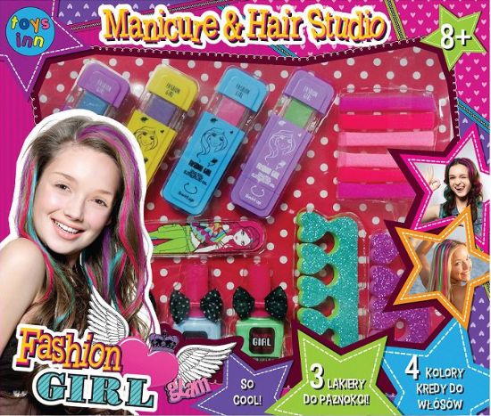 Zestaw zawera 4 kolory kredy do barwienia włosów, 3 lakiery do paznokci, pilnik oraz 6 gumek.