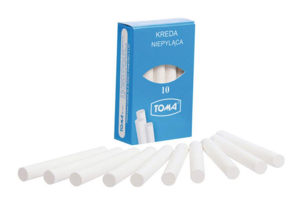 Niepyląca kreda do pisania, specjalny proces produkcji pozwala uzyskać wyjątkowo dużą gęstość produktu, co czyni go bardziej trwałym i ekonomicznym w użytkowaniu od innych. Dzięki unikalnej powłoce pokrywającej każdą pałeczkę, rece są zawsze czyste, a otoczenie jest wolne od pyłu kredowego. Zalety: idealna biel oraz atrakcyjne kolory, doskonały kontrast i łatwość pisania nawet po starych tablicach szkolnych.