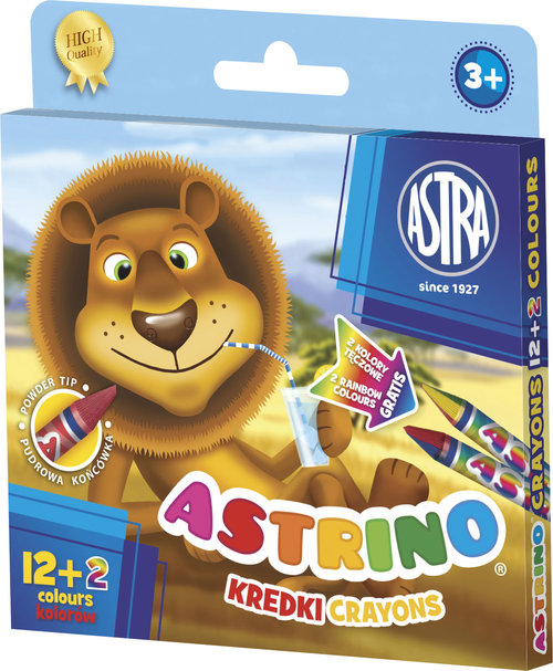 Kredki Astrino, 12 kolorów + 2 tęczowe kredki gratis.