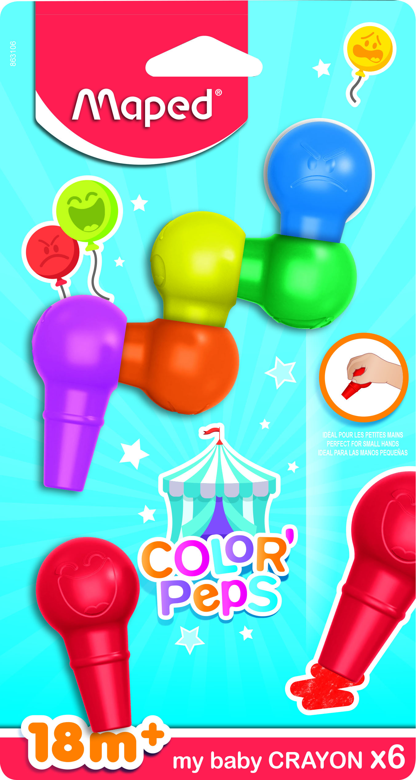 Plastikowe kredki Color'Peps BABY dla najmłodszych. Dedykowane dla dzieci już od 1 roku życia. Zaokrąglony kształt dopasowany do dziecięcej rączki. Kredki można ze sobą łączyć w dowolne konfiguracje. Rozwijają wyobraznię i kreatywność dziecka. Wplywają na poprawę koordynacji ruchowej. W zestawie 6 sztuk. Intensywne kolory. Nietoksyczne - wyprodukowane zgodnie z wszystkimi regulacjami dotyczacymi produktów dla dzieci.
